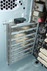 Il est temps maintenant de nous attaquer aux cartes d'extension. Ici également, le système se veut sans vis et sans outil, mais nous verrons que tout n'est pas toujours rose. Le système est très simple d'utilisation, puisqu'il suffit de lever légèrement le cache pour le faire pivoter et ainsi avoir accès aux emplacements. Deux photos valent mieux qu'un long discours :