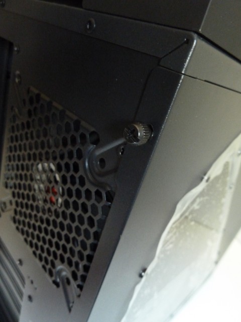 A l'arrière on trouve un des 2 ventilateurs fournis, les cartes PCI sont maintenues par des vis à main.