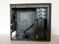 Une fois le panneau gauche enlevé, on s'aperçoit que le boîtier est full black. Il est loin le temps où les boîtiers d'entrée de gamme étaient blanc et d'un intérieur gris acier. Un ventilateur de 120mm peut être installé sur le panneau droit et comme souvent aucun filtre n'est installé.