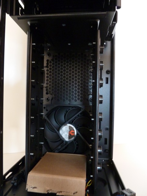 Sur le bas, on trouve l'emplacement de l'alimentation vers l'arrière et un emplacement pour ventilateur 120mm. Les filtres sont fixés sous le boîtier pour les nettoyer facilement.