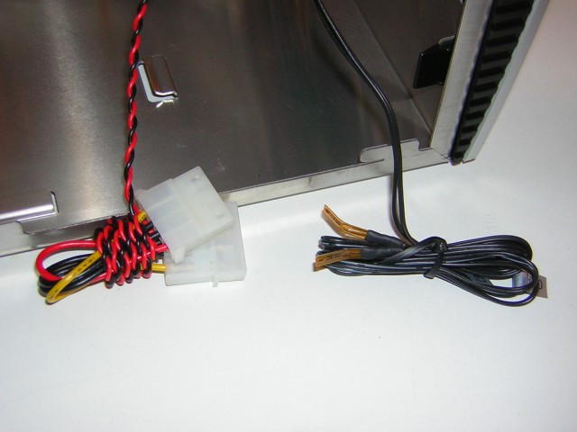 Le petit écran en façade est alimenté par une prise molex 4 pins et il dispose de 2 sondes qui sont destinées pour le processeur et l'autre pour un disque dur. Ensuite nous trouvons les connectiques classiques (pour les boutons power et reset, les leds d'activités du disque dur et de la mise en marche du PC) et celles pour les ports présents en façade (USB 2.0, Firewire, casque et micro) :